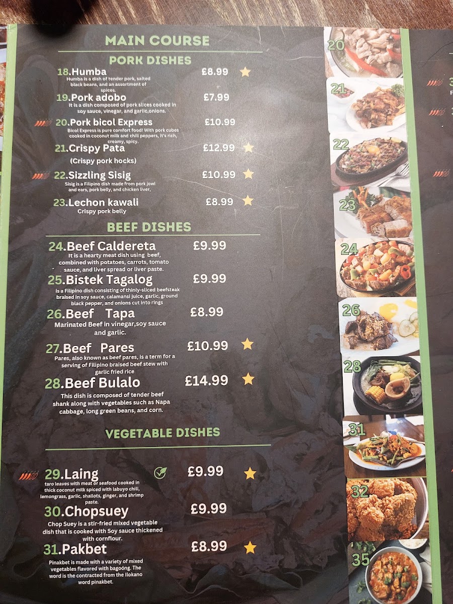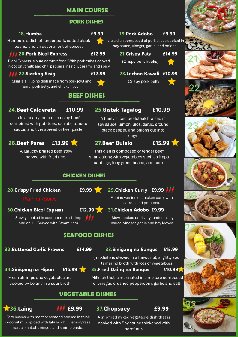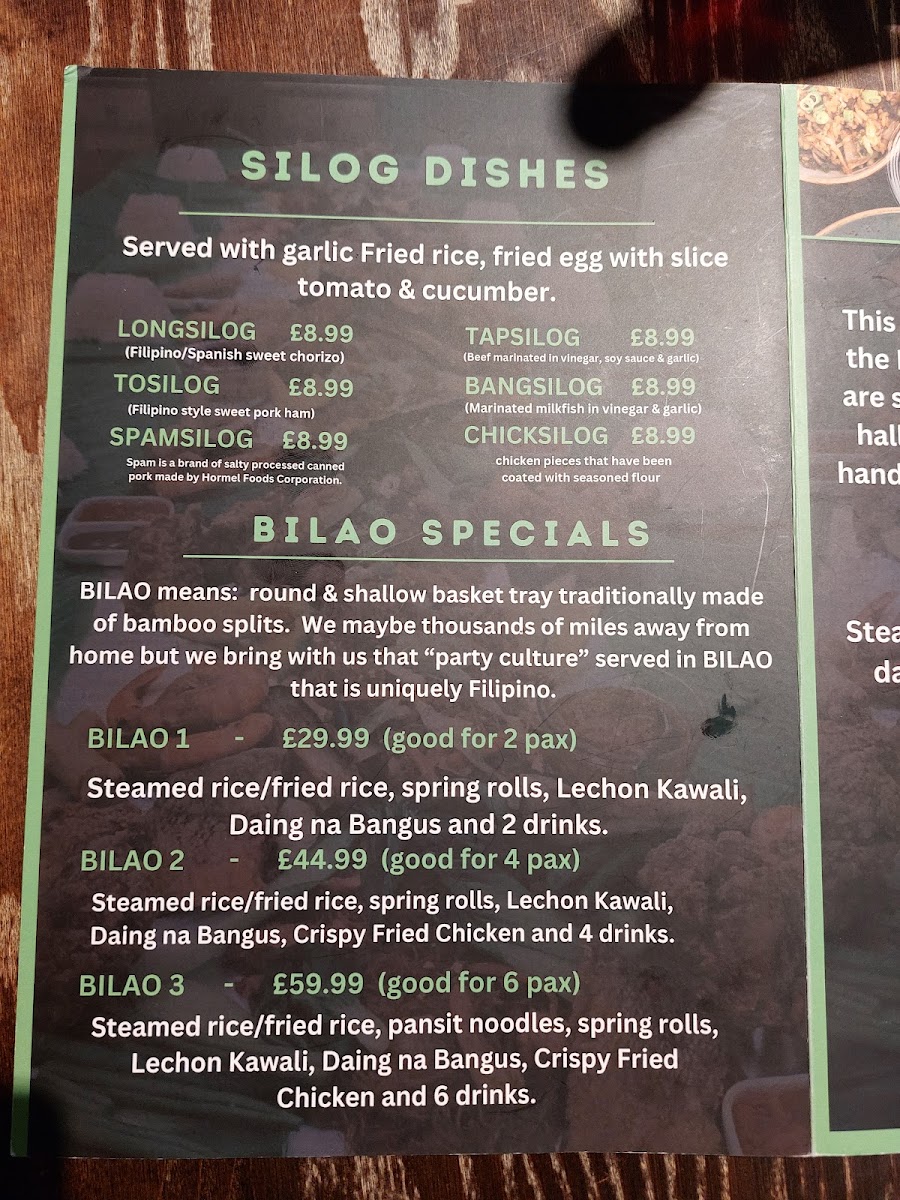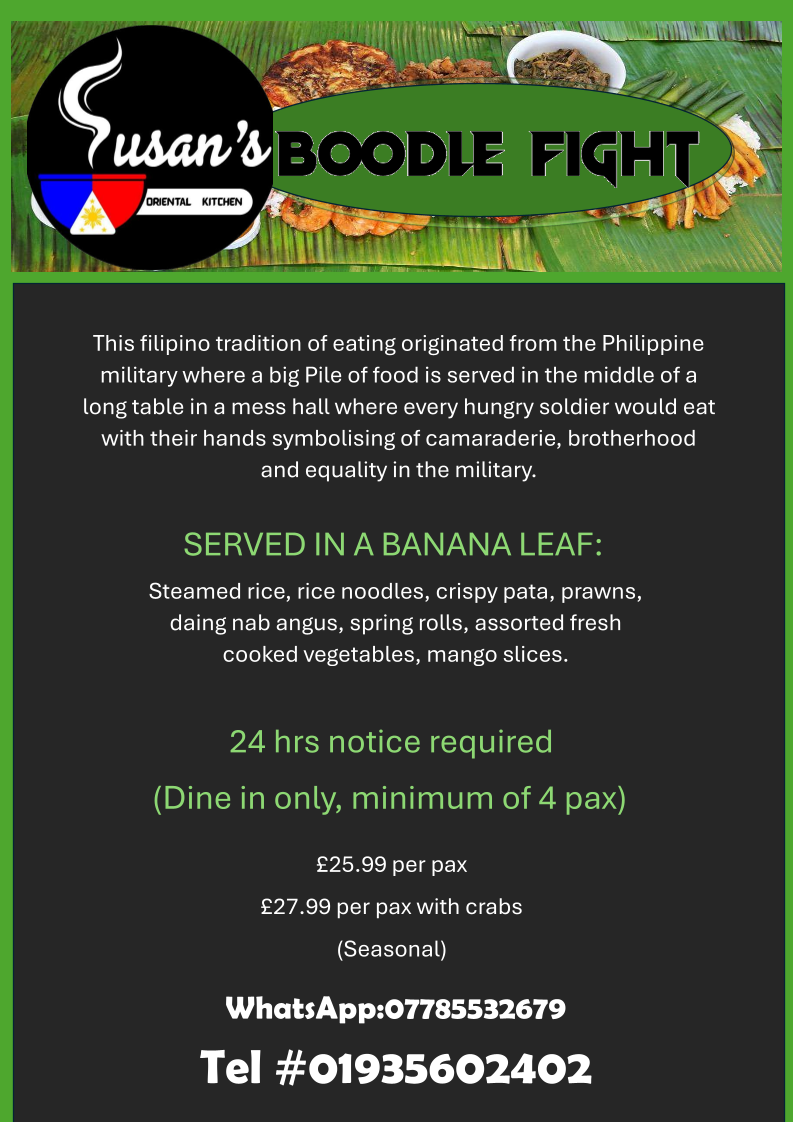 Steamed rice, rice noodles, crispy pata, prawns, daing nab angus, spring rolls, assorted fresh cooked vegetables, mango slices. Served in a Banana Leaf. 24 hrs notice required (Dine in only, minimum of 4 pax)