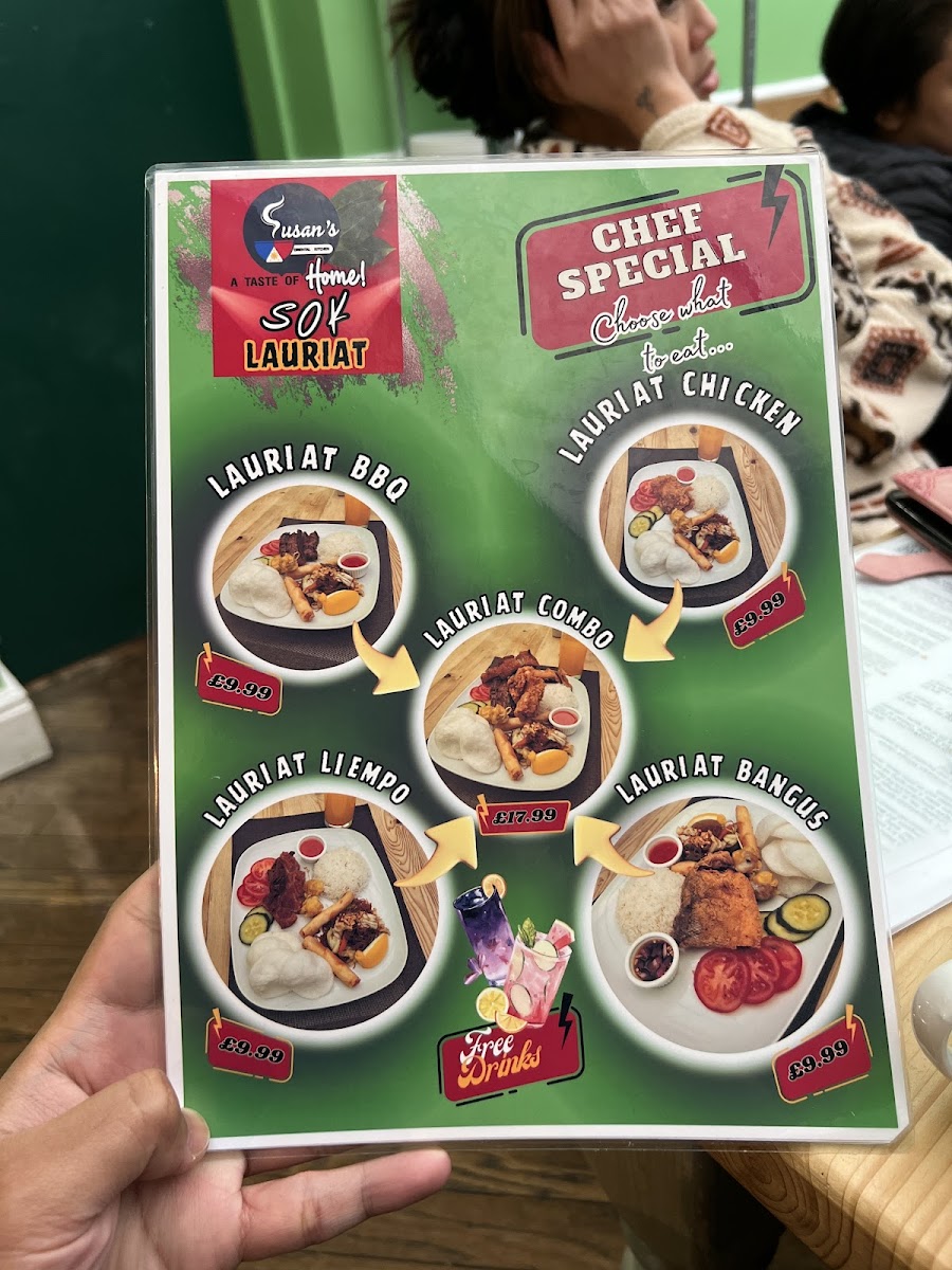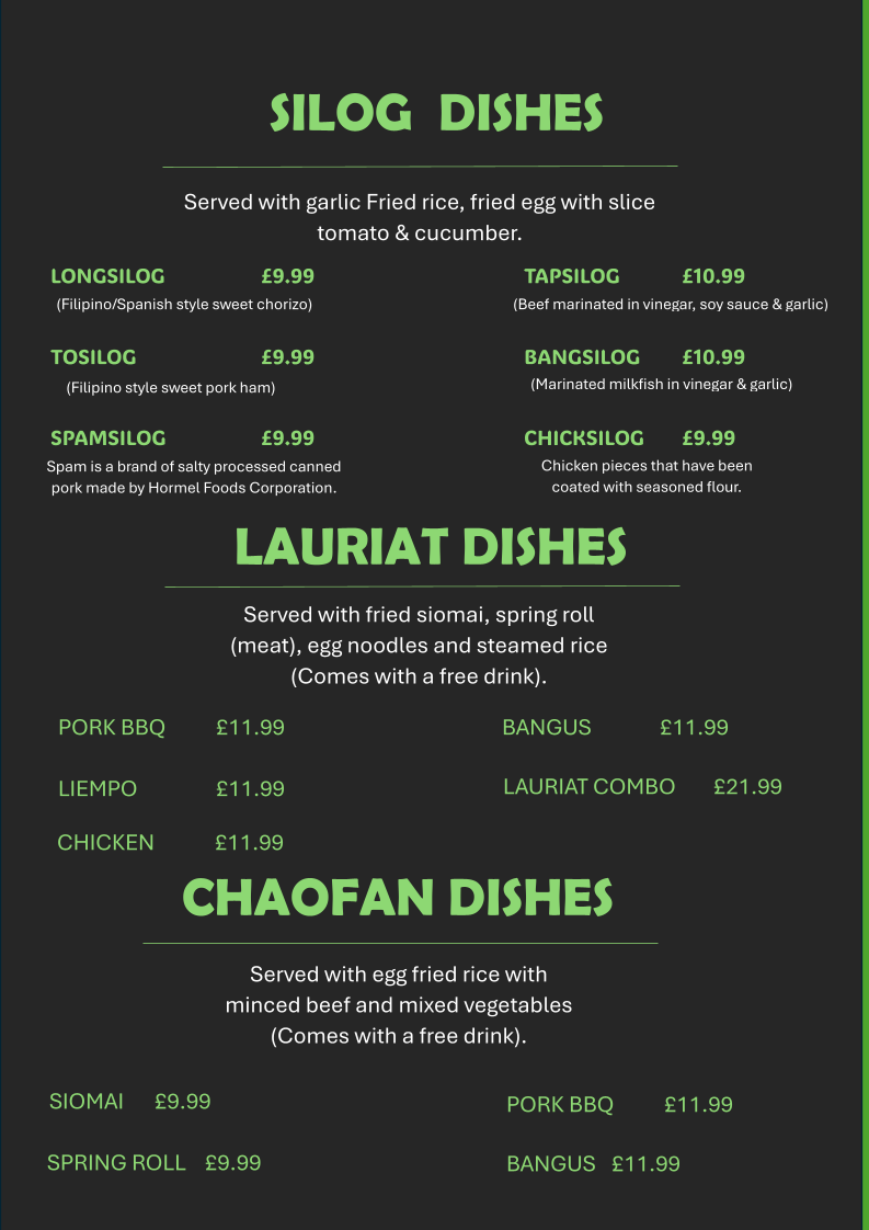 Steamed rice/fried rice, pansit noodles, spring rolls, Lechon Kawali, Daing na Bangus, Crispy Fried Chicken and 6 drinks. (good for 6 pax)